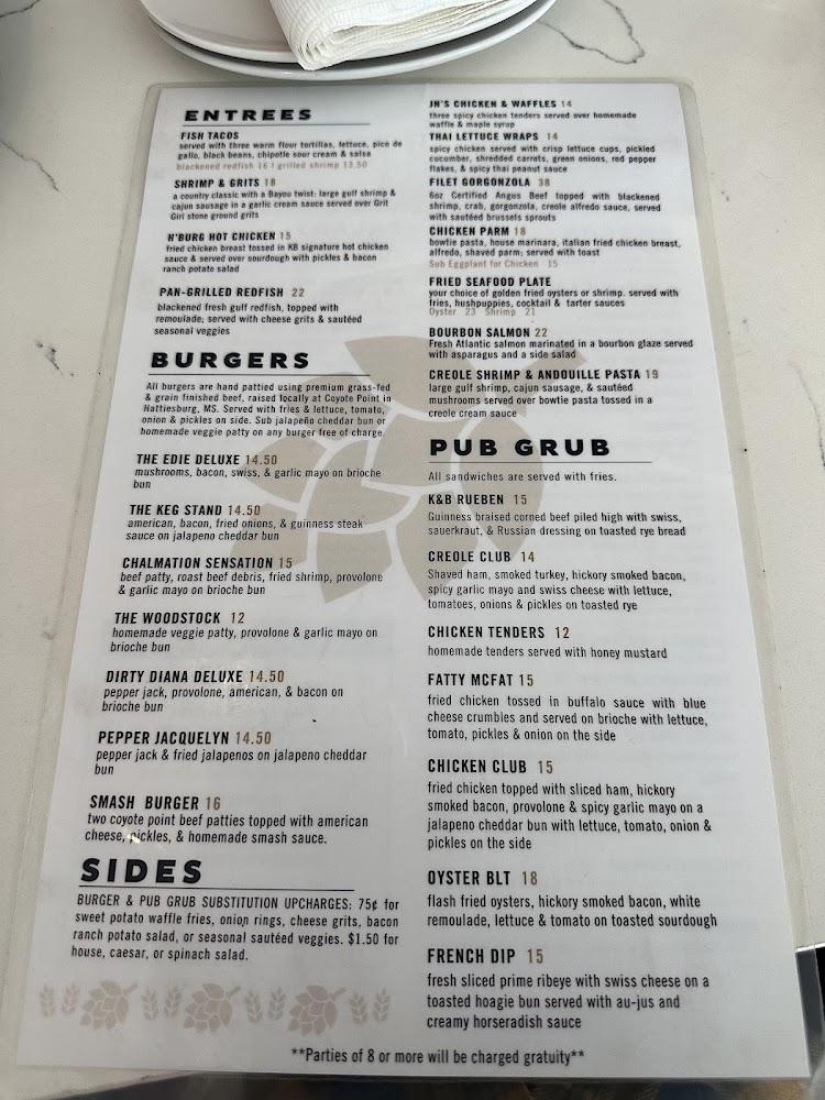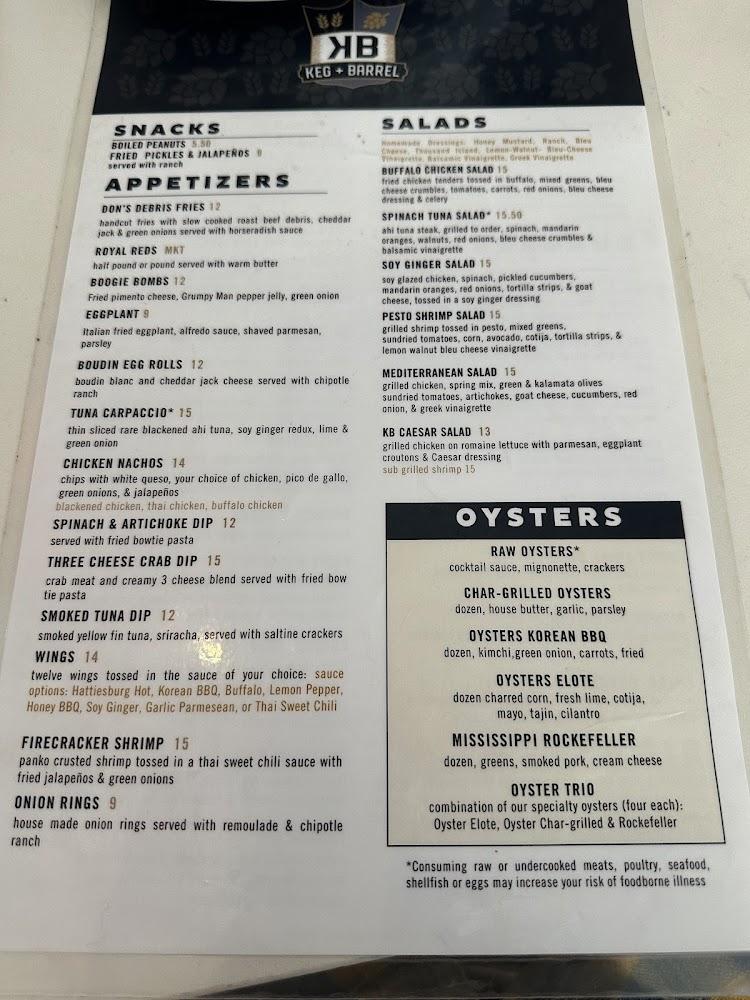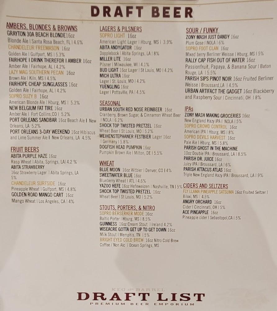 Welcome to Keg & Barrel - Ocean Springs, your go-to destination for a casual yet vibrant dining experience in the heart of Ocean Springs. Indulge in a diverse menu featuring delicious local specialties, refreshing cocktails, and an extensive beer selection, all while enjoying live music and a laid-back atmosphere. Our welcoming space offers both indoor and outdoor seating, accessible facilities, and a private dining room for special gatherings. Perfect for lunch, dinner, or solo dining, Keg & Barrel is renowned for its friendly service and quick meals, making it an ideal spot for tourists and locals alike. Join us for happy hour and savor delightful desserts!